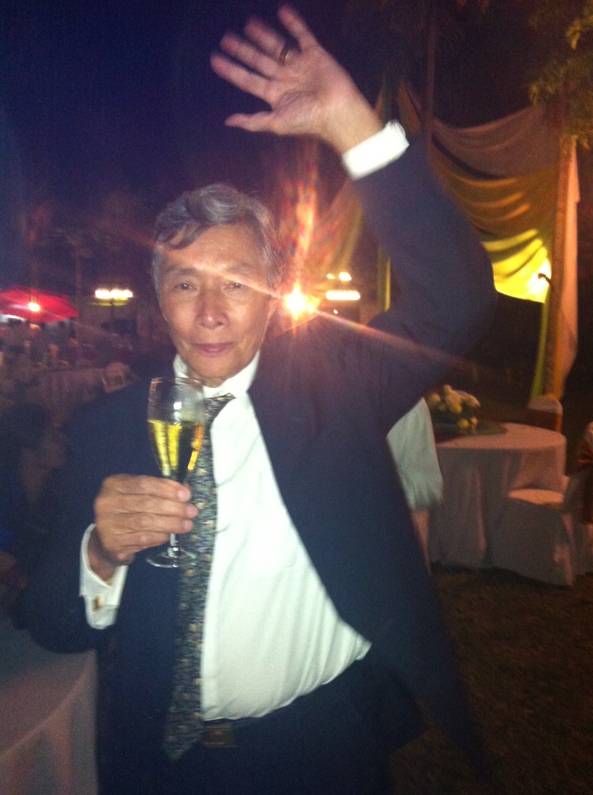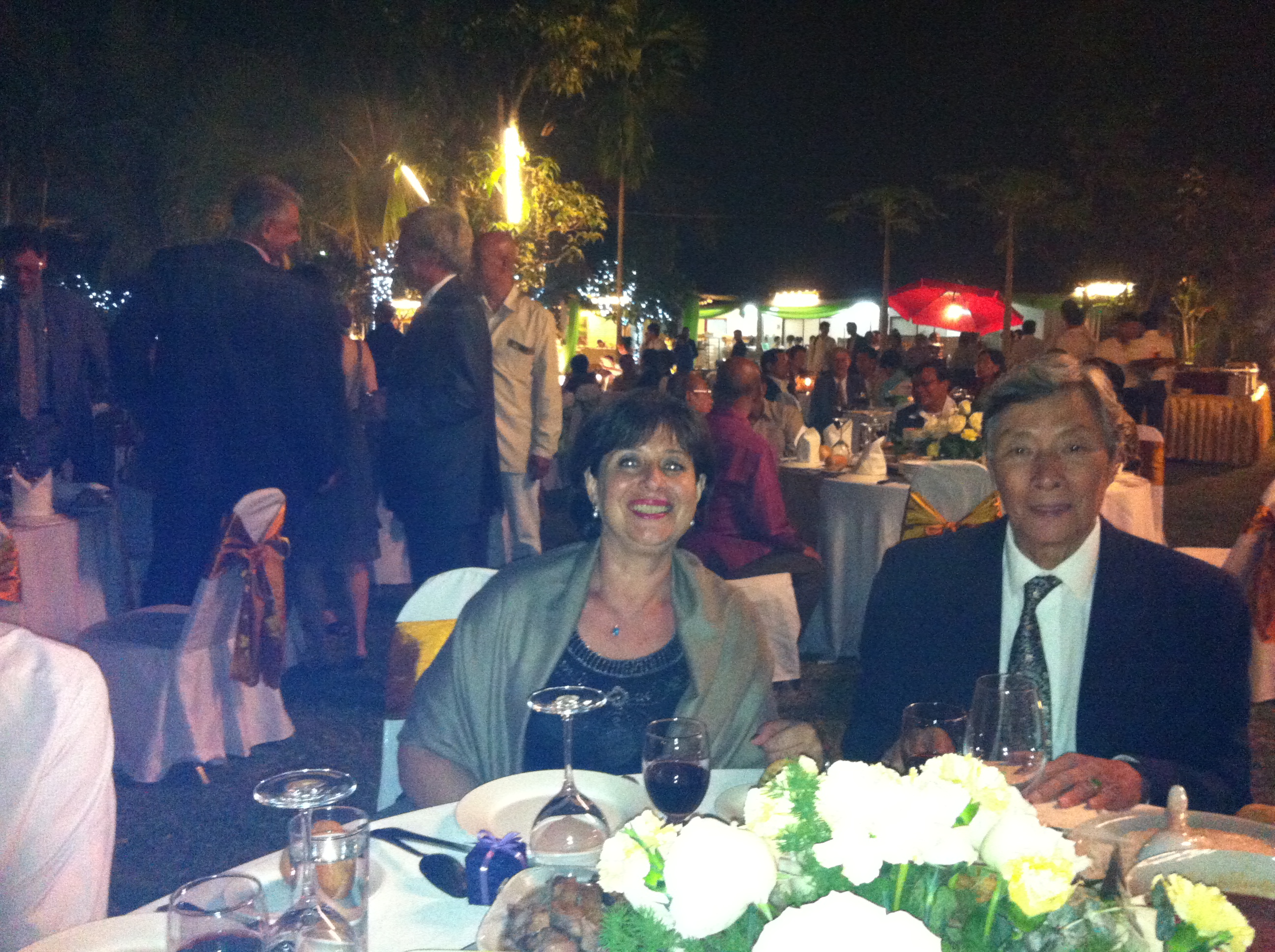 Le millier d’invités, expats (et tous les ambassadeurs notamment) et locaux (la plupart des ministres et du gratin local) se mélangeaient gaiement. Les plats laotiens étaient sur les tables recouverts de plastique qu’on ne découvre qu’après les discours (dont celui de Mixay tant il est vrai qu’il est le roi de toutes les fêtes, au point que son cousin m’a dit qu’on considère au Laos qu’une fête n’a pas eu lieu si Michel n’y a pas été invité 😉 ). Je signale au passage que le cousin (anglais) en question a une agence de voyage spécialisée dans le tourisme d’américains en Europe…qu’il traite depuis le Laos. Cosmopolite avez-vous dit ????