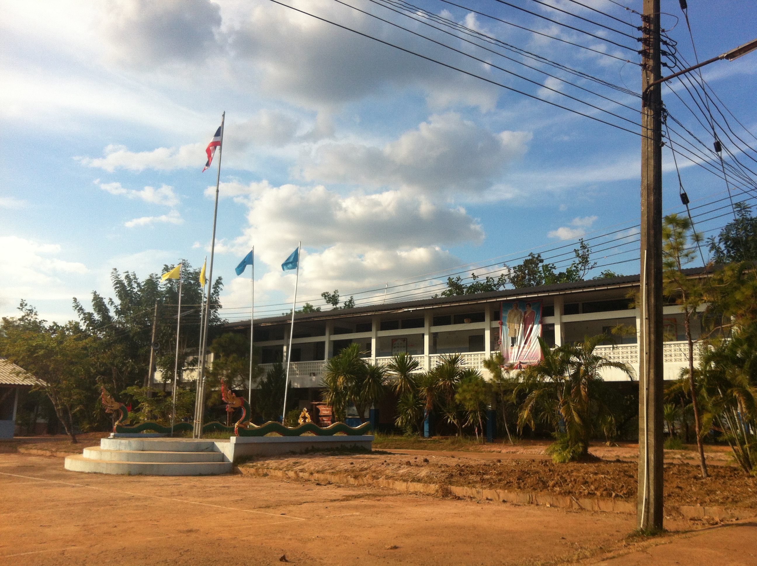 Mais pour l’instant, c’est aux fins fonds de la Thailande que je me trouve, depuis quelques quelques heures, et j’ai déjà rencontré le directeur de l’Ecole où je vais enseigner (à des élèves, mais aussi à des enseignants et même au directeur, voire au Commissaire de Police de la région !). Le directeur, qui a mon âge et qui est né un 10 janvier comme mon fils, m’a l’air infiniment sympathique et intelligent. Il m’a fait faire le tour de l’école. Ici, il y a le bâtiment des matières principales (sciences humaines, chimie, langues et informatique ) et celui des matières secondaires (Thai, maths et sciences sociales) …curieux comme les valeurs peuvent différer d’une culture à l’autre !