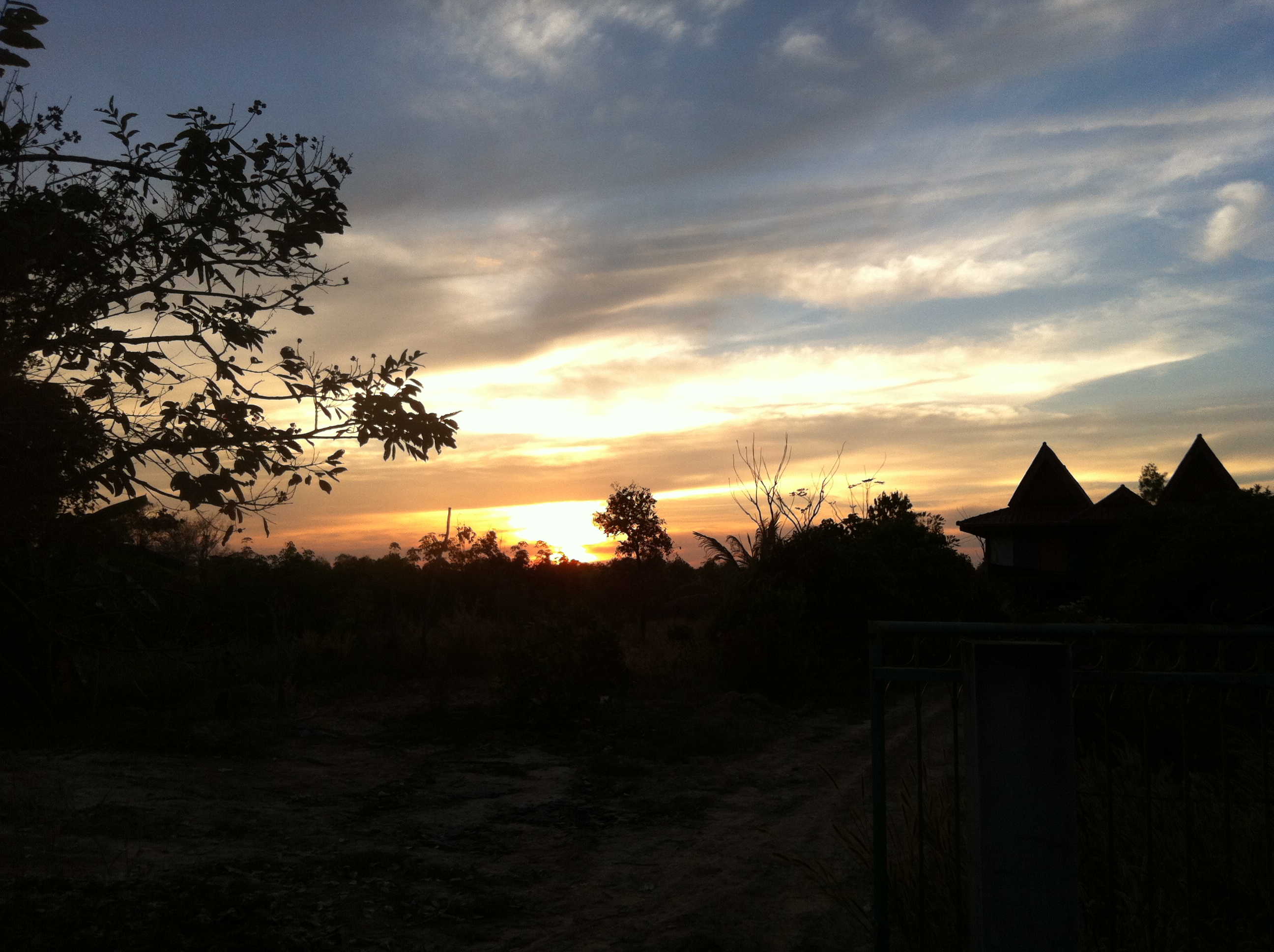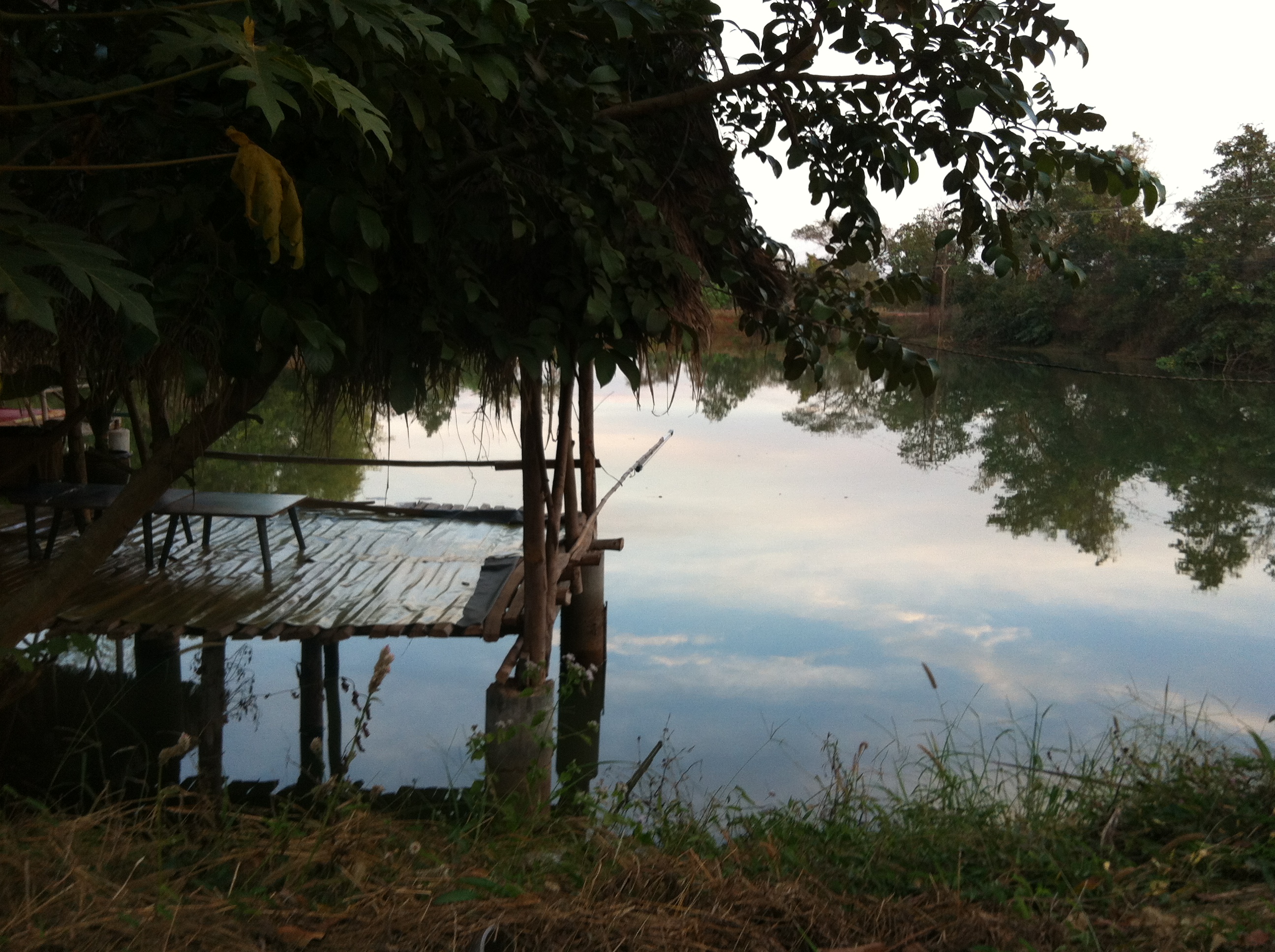 Elle m’a ensuite emmenée en mobylette et sans casque au marché situé à 1 km de là…je m’efforçais d’admirer les rizières plutôt que de me demander si j’étais bien la même mère juive qui refuse que son fils fasse de la moto ou du ski sans casque ! Mais le marché était sympathique, j’y ai acheté deux Tshirts pour 320 bahts (3 dollars ou moins de 4 euros), quelques fruits et hop, le tour est joué, nous sommes de retour et j’admire depuis mon porche le coucher de soleil (PHOTO) et le petit étang situé juste à côté de ma maison