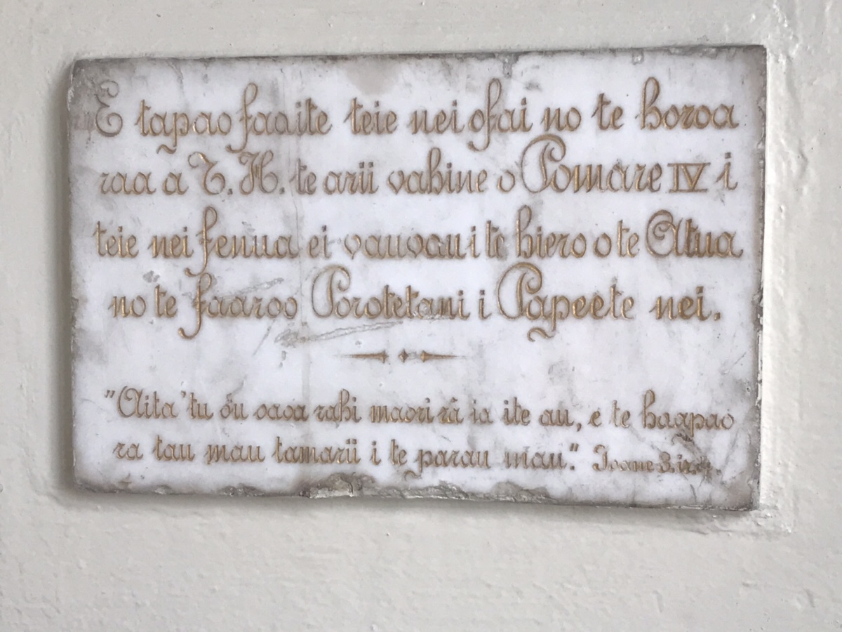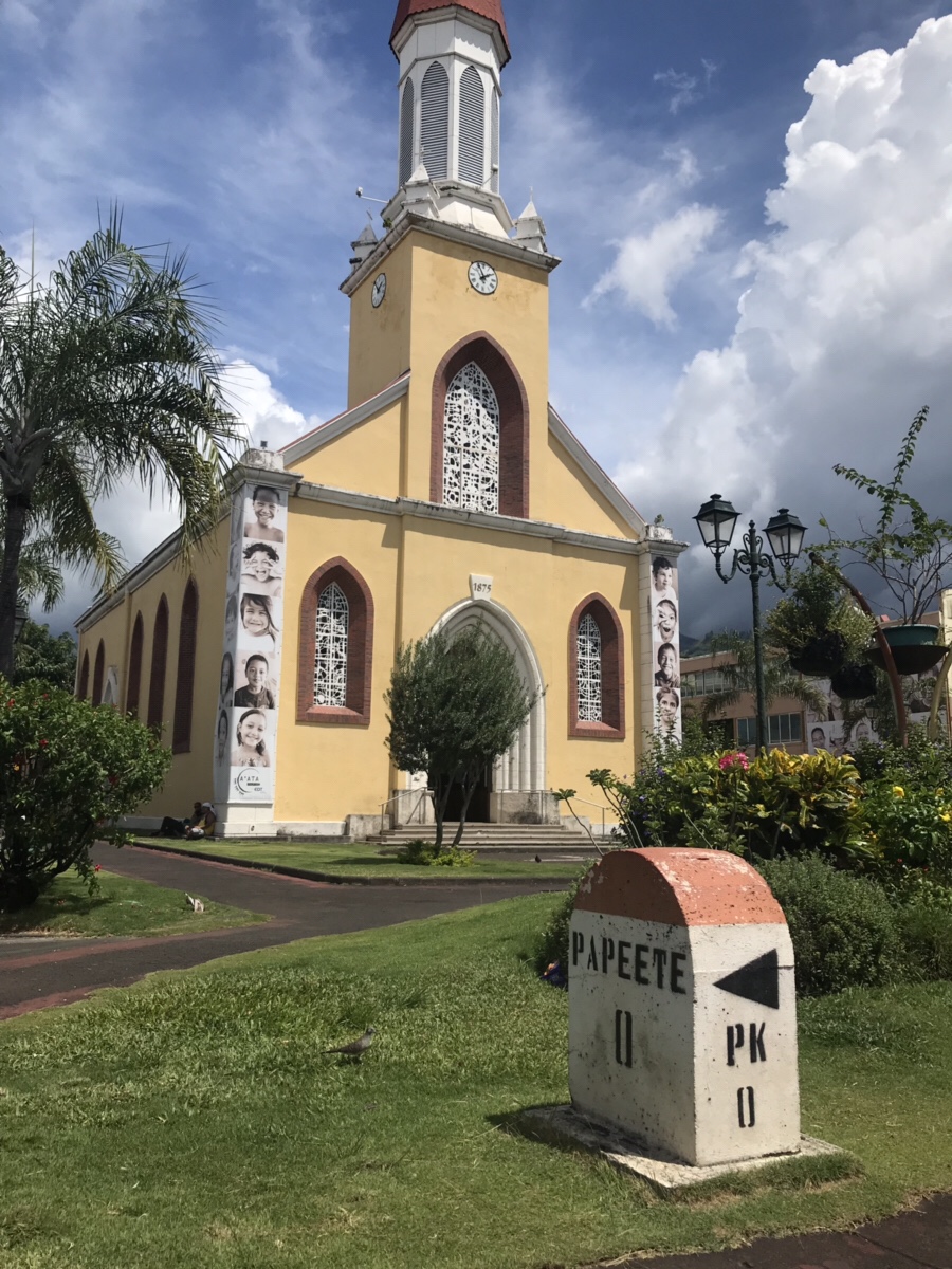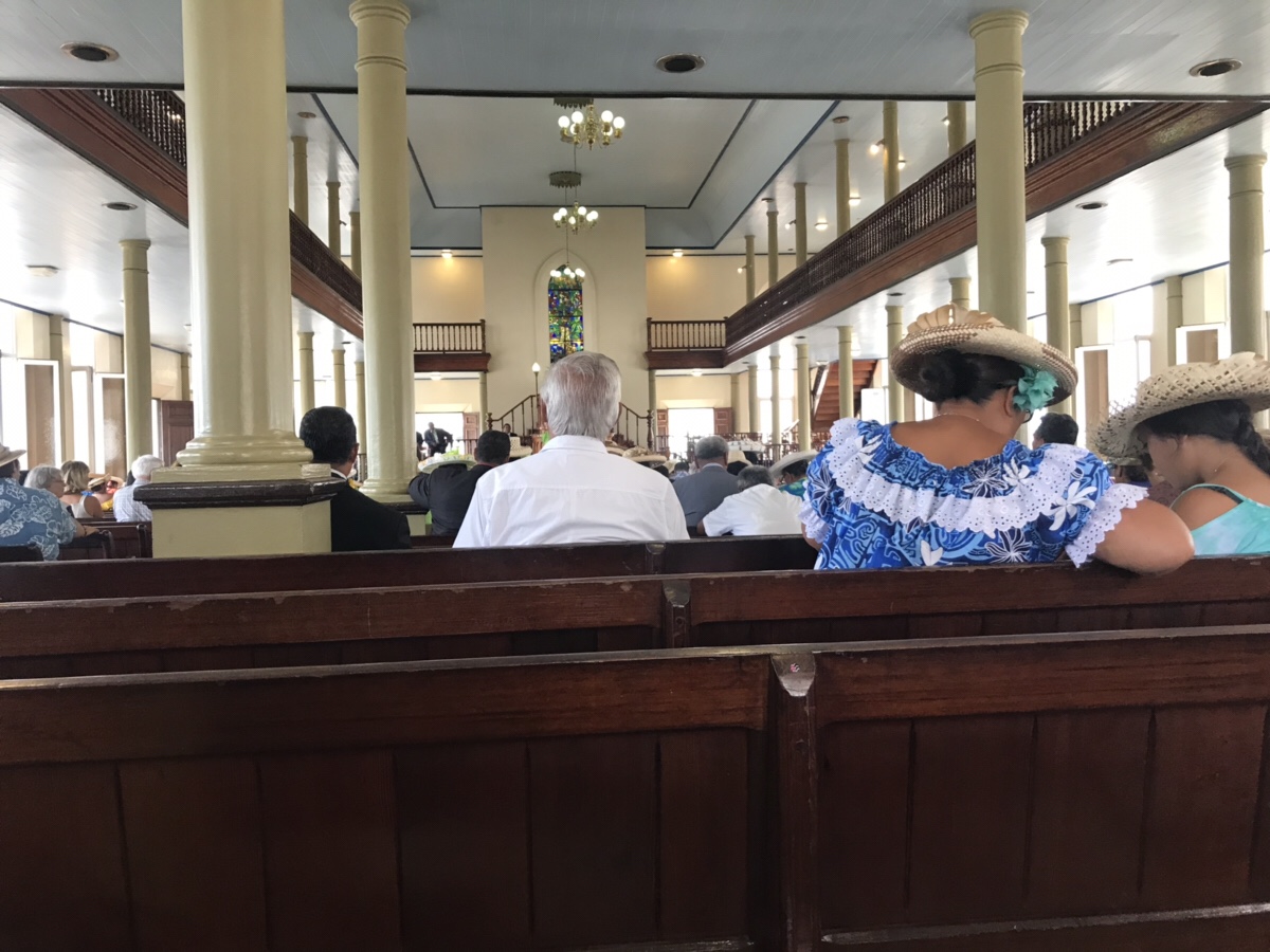 Arrivée un samedi soir dans le charmant Fare Suisse tout simple où je me suis sentie comme chez moi, j’ai eu le plaisir d’assister le dimanche (ville morte ou presque du vendredi 11 heures au lundi matin !) à l’office coloré et vibrant …entièrement en Tahitien…du temple protestant, apprenant à cet effet que le protestantisme est la première religion par la grâce des pasteurs de leurs très gracieuses majestés