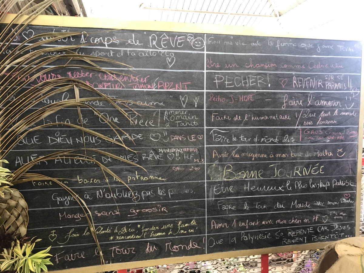 Dès que l’on sort de Papeete on trouve des petits coins simples et délicieux, des gens charmants et cet air de bout du monde à quelques encablures de la grande ville, ses restaurants, ses roulottes mais surtout son marché! C’est en prenant un café au premier étage, à côté des célébrissimes panneaux de vœux, que j’ai appris l’existence de la compagnie Eco-Cars qui pour un prix modique fournit des prestations formidables!