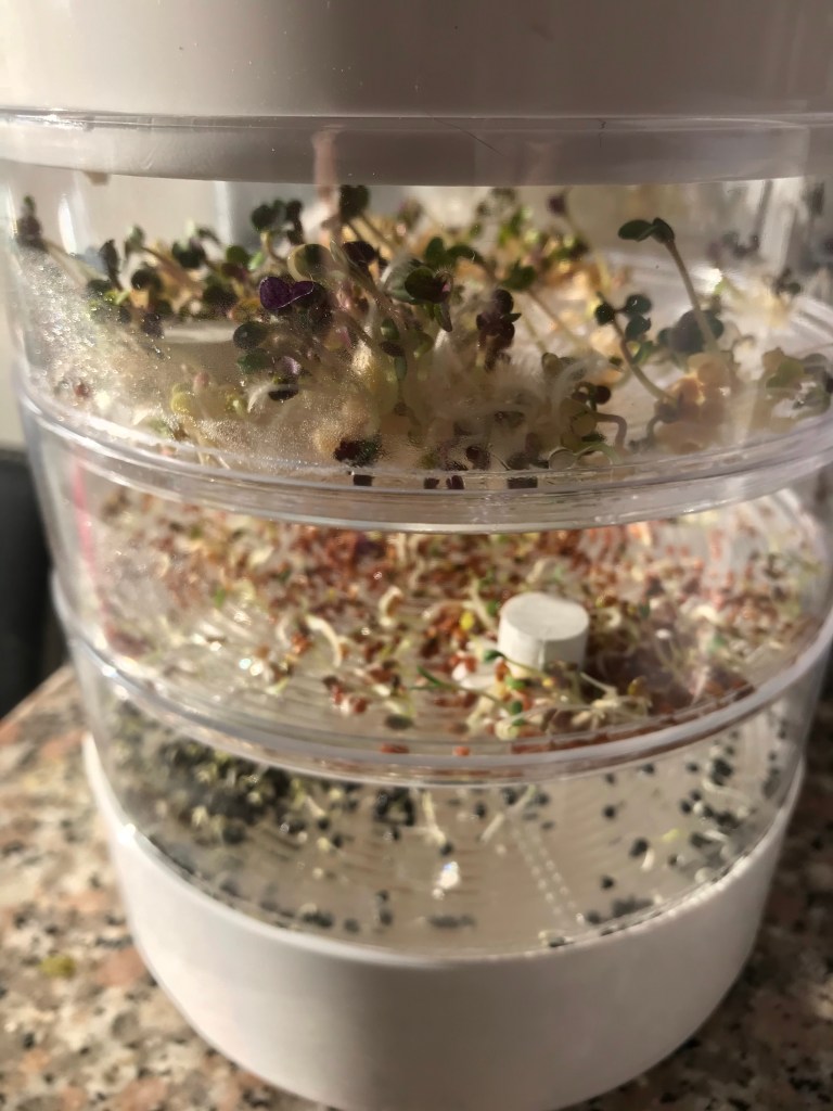 Ma journée fut fort paresseuse, bien que levee tôt avec toutes les intentions de sortir, je suis finalement restée à la maison À faire la cuisine, beaucoup de légumes préparés de diverses façons crus ou cuits avec des germes délicieux!