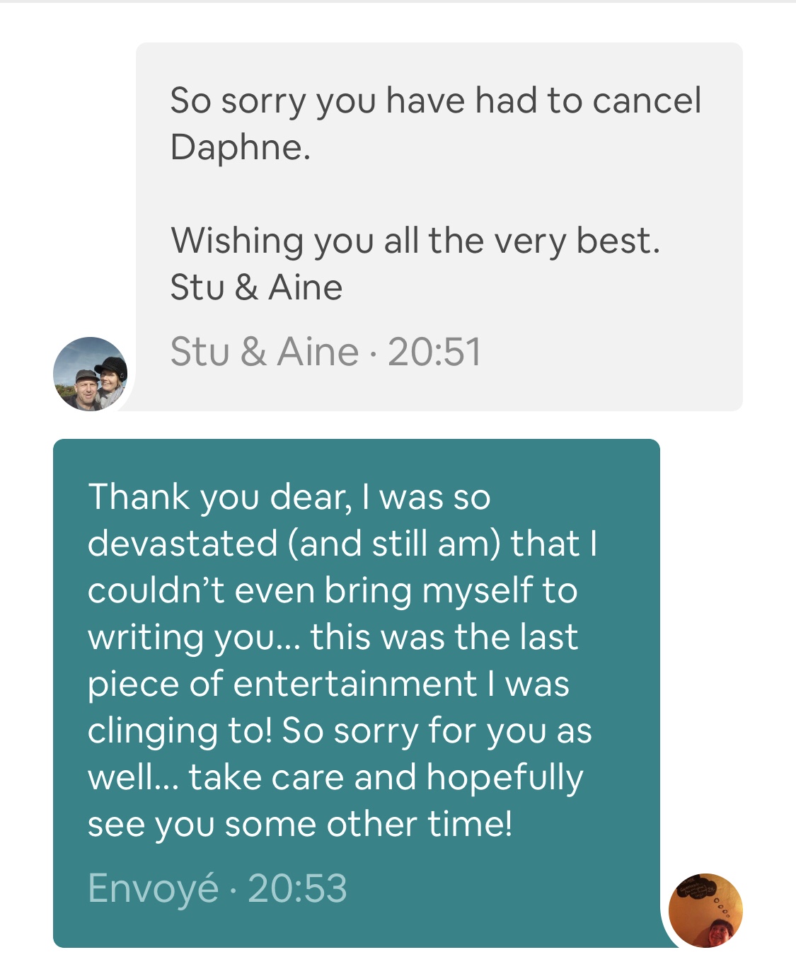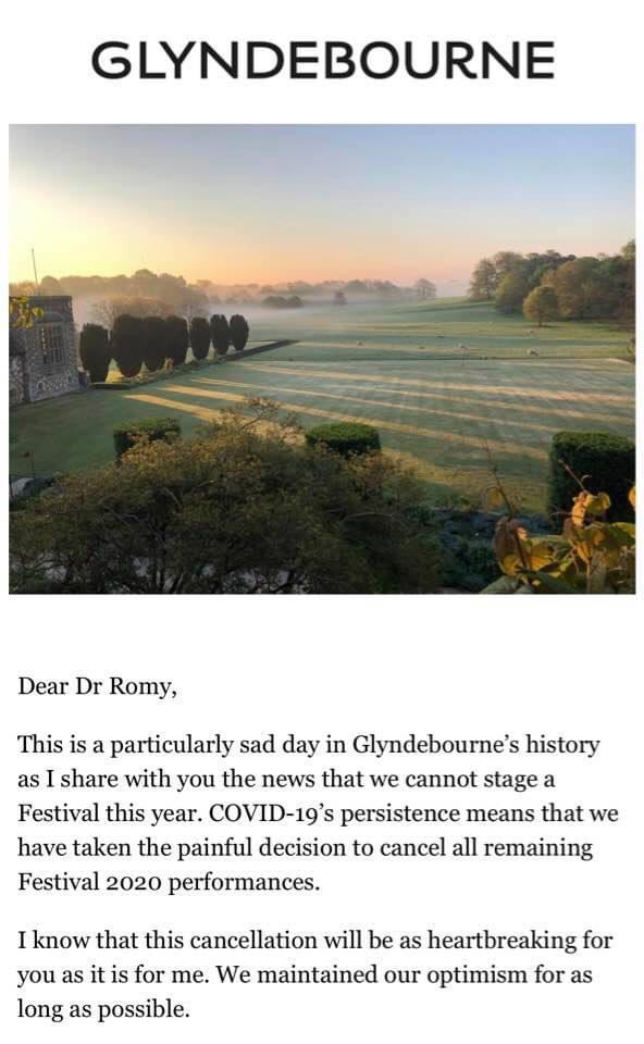 …But this email from Gus Christie is the end of any plan whatsoever and I have to admit it made me particularly emotional. It’s ridiculous of course since so much is happening and so many people are miserable but I was sort of clinging to this very last little opera at the end of the season and kept hoping against all odds. No matter how silly I sound, this is how I’ve come to realise that we had come to the end of an era, not really a sort of passing problem that would soon be sorted but a major crisis no one can predict the end of.